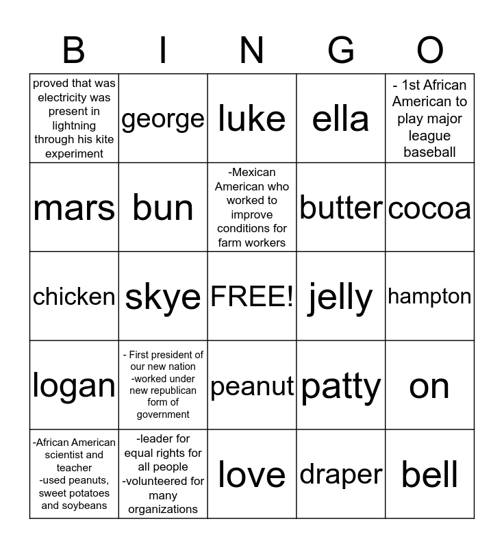 This bingo card has a free space and 24 words: - First president of our new nation -worked under new republican form of government, -leader for equal rights for all people -volunteered for many organizations, -Mexican American who worked to improve conditions for farm workers, -African American scientist and teacher -used peanuts, sweet potatoes and soybeans, - 1st African American to play major league baseball, proved that was electricity was present in lightning through his kite experiment, mars, george, jelly, peanut, butter, chicken, patty, on, bun, draper, hampton, luke, cocoa, skye, bell, logan, ella and love.