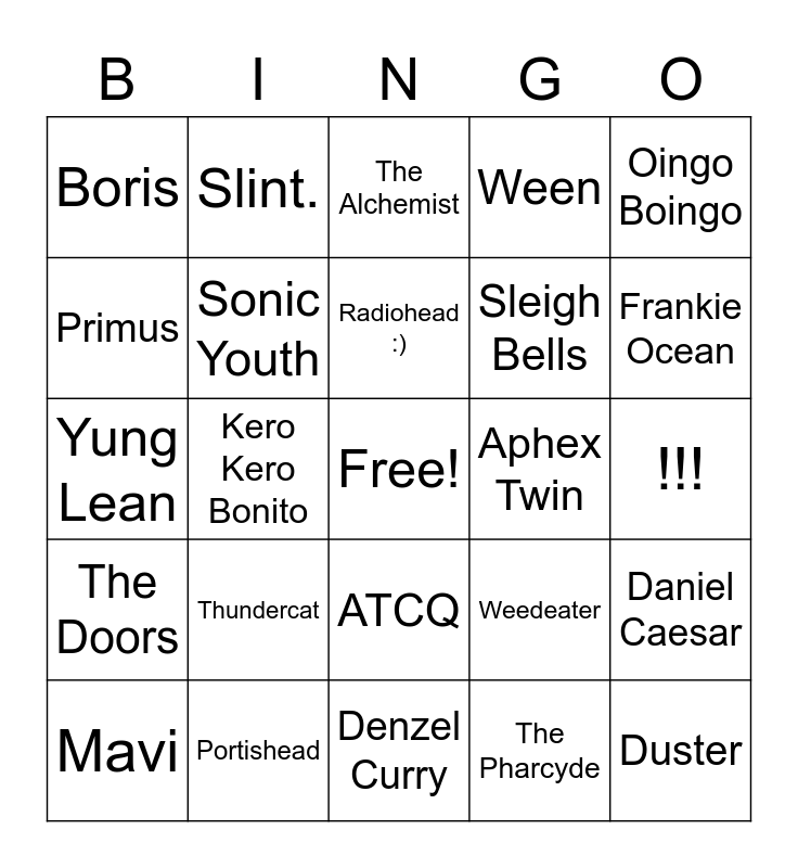 This bingo card has a free space and 24 words: Thundercat, Portishead, Radiohead :), Mavi, Oingo Boingo, Boris, Primus, Slint., Aphex Twin, ATCQ, Sleigh Bells, Yung Lean, Weedeater, Daniel Caesar, Sonic Youth, The Pharcyde, !!!, The Alchemist, Frankie Ocean, Kero Kero Bonito, Duster, The Doors, Ween and Denzel Curry.