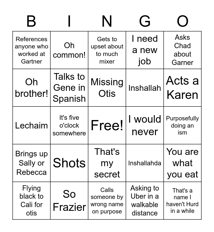 This bingo card has a free space and 25 words: Shots, Calls someone by wrong name on purpose, Missing Otis, Flying black to Cali for otis, Asks Chad about Garner, References anyone who worked at Gartner, Oh brother!, Oh common!, I would never, That's my secret, Inshallah, Lechaim, Inshallahda, You are what you eat, Talks to Gene in Spanish, Purposefully mispronouncing Spanish words, Purposefully doing an ism, Gets to upset about to much mixer, Acts a Karen, It's five o'clock somewhere, That's a name I haven't Hurd in a while, So Frazier, Brings up Sally or Rebecca, I need a new job and Asking to Uber in a walkable distance.
