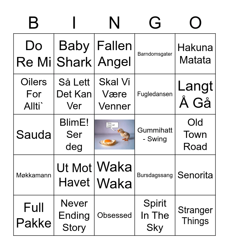 This bingo card has a free space and 29 words: Full Pakke, Dance Monkey, BlimE! Ser deg, Love Is Forever, Do Re Mi, Fallen Angel, Så Lett Det Kan Ver, Ut Mot Havet, Gummihatt - Swing, Never Ending Story, Old Town Road, Stranger Things, Obsessed, Spirit In The Sky, Langt Å Gå, Floden, Waka Waka, Møkkamann, Hakuna Matata, Sauda, Bursdagssang, The Fox, Fugledansen, Oilers For Allti`, Barndomsgater, Baby Shark, Senorita, Skal Vi Være Venner and Viking E Tebage.