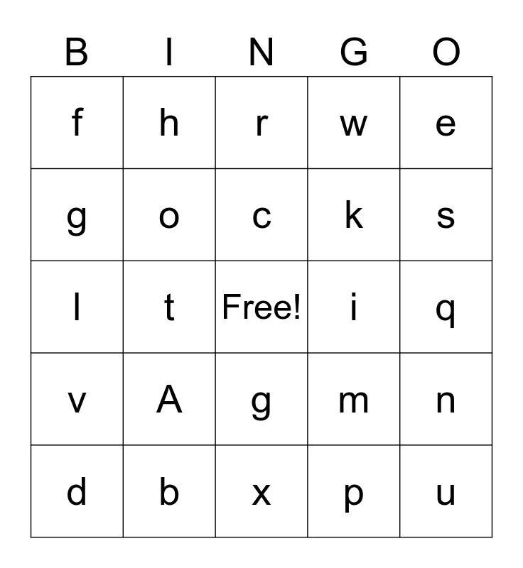 This bingo card has a free space and 24 words: A, b, c, d, e, f, g, h, i, g, k, l, m, n, o, p, q, r, s, t, u, v, w and x.