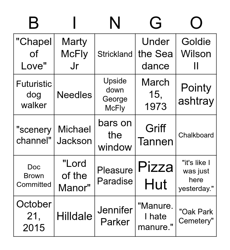 This bingo card has 55 words: Free!, October 21, 2015, Grey's Sports Almanac, "Chapel of Love", Jennifer Parker, "Who you callin' "butthead", Butthead?", Needles, Mattel Hoverboard, March 15, 1973, Nike "Air Mag" shoes, Under the Sea dance, The cubbies win the world series, Ski-rope, Walkie-talkies, Ruth's dress shop, Wall safe, Goldie Wilson II, Michael Jackson, "say hi to your grandma for me", bars on the window, Griff Tannen, "thumb a hundred bucks will ya,", Pizza Hut, Strickland, Porch swing, Upside down George McFly, "Manure. I hate manure.", Einstein, Chalkboard, "it's like I was just here yesterday.", 1947 Ford, YOU'RE FIRED, Biff watching tv in hottub, "It's *leave*, you idiot!", Futuristic dog walker, "scenery channel", Wild Gunman, Doc Brown Committed, "Oak Park Cemetery", Cafe 80's, Marty McFly Jr, Marlene McFly, Biff Tannen Museum, Doc Brown's Hawaiian Train Shirt, "Lord of the Manor", Hilldale, Texaco, Oh La La, "3793 Oakhurst Street", Pointy ashtray, Top of Biff's cane, "sleep-inducing alpha rhythm generator.", Doc Brown, Pleasure Paradise and Pepsi Perfect sign.