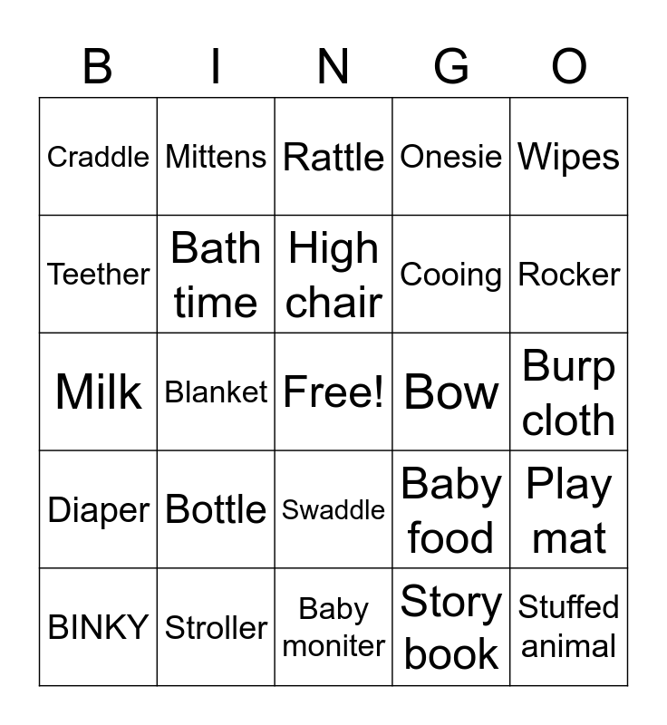 This bingo card has a free space and 29 words: BINKY, Carseat, Blanket, Bibs, Craddle, Rattle, Bath time, Bottle, Bow, Stroller, Burp cloth, Stuffed animal, Baby moniter, Story book, Rocker, Crib, Swaddle, Diaper, Wipes, Milk, Baby food, Burps, Cooing, Teether, Onesie, Mittens, Play mat, High chair and Baby spoon.