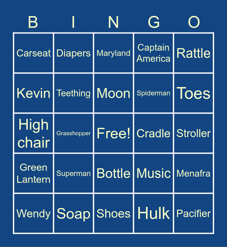 This bingo card has a free space and 67 words: Sarah, Cliff, Scotty, Menafra, Boy, Avengers, Diapers, Twinkle, Moon, Stars, Bottle, Milk, Stroller, Rattle, Crib, Kevin, Grasshopper, Carseat, Batman, Spiderman, Superman, Green Lantern, Captain America, Hulk, Iron Man, Snuggle, Cuddle, Fingers, Toes, Boppy, Pacifier, Crawl, Baby, Packers, Powder, Wendy, Toys, Music, High chair, Swing, Bouncer, Teething, Cradle, Mobile, Onesie, Wipes, Lotion, Soap, Bib, New Jersey, Maryland, North Carolina, Tub, Monitor, Diaper bag, Shoes, Socks, Burp cloth, Diaper cream, Lullaby, Sleep, Nursery, Nap time, Blanket, Jammies, Mommy and Daddy.