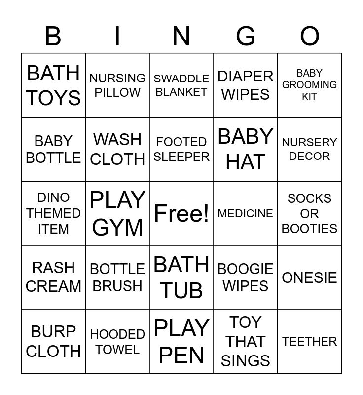 This bingo card has a free space and 41 words: PACIFIER, DINO THEMED ITEM, CHANGING PAD, WASH CLOTH, HOODED TOWEL, BATH TUB, FOOTED SLEEPER, STUFFED ANIMAL, BABY GROOMING KIT, RASH CREAM, PLAY GYM, DIAPER WIPES, TEETHER, SOCKS OR BOOTIES, MEDICINE, BOTTLE BRUSH, Stroller, BATH TOYS, Car Seat, SWADDLE BLANKET, ONESIE, BABY SHAMPOO, PLAY PEN, BABY HAT, BABY POWDER, BABY BIB, TOY THAT SINGS, BABY MONITOR, NURSERY DECOR, DIAPERS, BABY MITTS, NURSING PILLOW, BURP CLOTH, BABY CARRIER, BOOGIE WIPES, BABY BOTTLE, BABY BOOK, CRIB SHEETS, BABY LOTION, TOY THAT SQUEAKS and SHIRT & PANT SET.