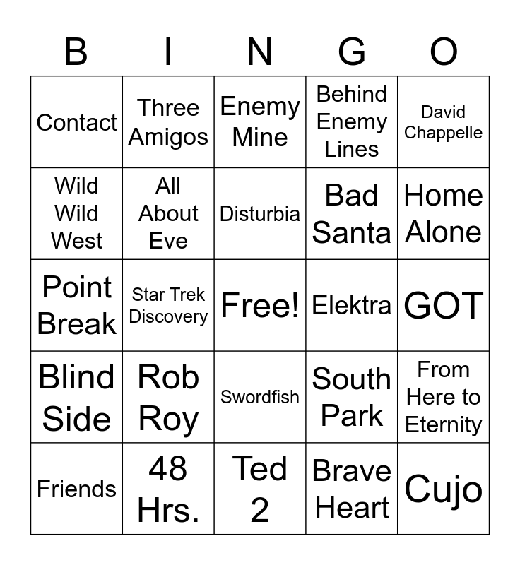 This bingo card has a free space and 58 words: 10 Cloverfield Lane, 48 Hrs., 2012, Blind Side, Brave Heart, Aladdin, All About Eve, Austin Powers, Bad Santa, Short Circuit, Behind Enemy Lines, Bosom Buddies, Breakdown, Carrie, Burlesque, Contact, Cujo, David Chappelle, Die Another Day, Disturbia, Elektra, Enemy Mine, Friends, From Here to Eternity, Galaxy Quest, GOT, Gremlins, Harry Potter, Home Alone, Home Improvement, Hulk, Fantastic Four, I am Legend, Day After Tomorrow, Vikings, John Candy, Patriot Games, Star Trek Discovery, Point Break, First Blood, Rob Roy, Snakes on a Plane, South Park, Spectre, Speed, Star Trek 2009, Super 8, Swordfish, Ted 2, The Karate Kid, The Dead Zone, The Net, Psycho, Tommy, Three Amigos, True Lies, Wild Wild West and The Wolverine.