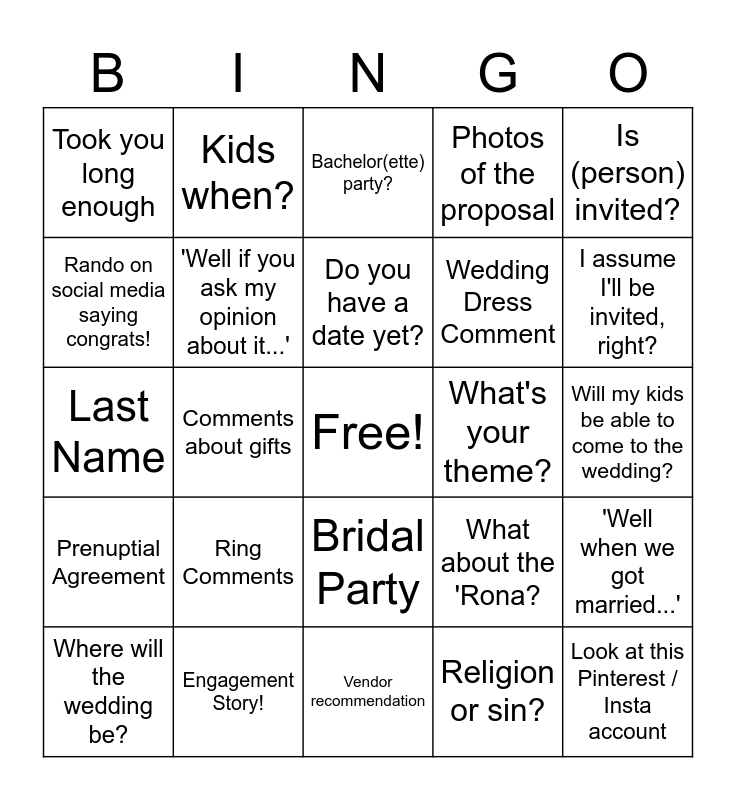 This bingo card has a free space and 24 words: Ring Comments, Engagement Story!, Do you have a date yet?, Where will the wedding be?, Is (person) invited?, Took you long enough, Rando on social media saying congrats!, Kids when?, What's your theme?, Bridal Party, Wedding Dress Comment, Last Name, What about the 'Rona?, 'Well when we got married...', 'Well if you ask my opinion about it...', Religion or sin?, Will my kids be able to come to the wedding?, Bachelor(ette) party?, I assume I'll be invited, right?, Comments about gifts, Look at this Pinterest / Insta account, Prenuptial Agreement, Photos of the proposal and Vendor recommendation.
