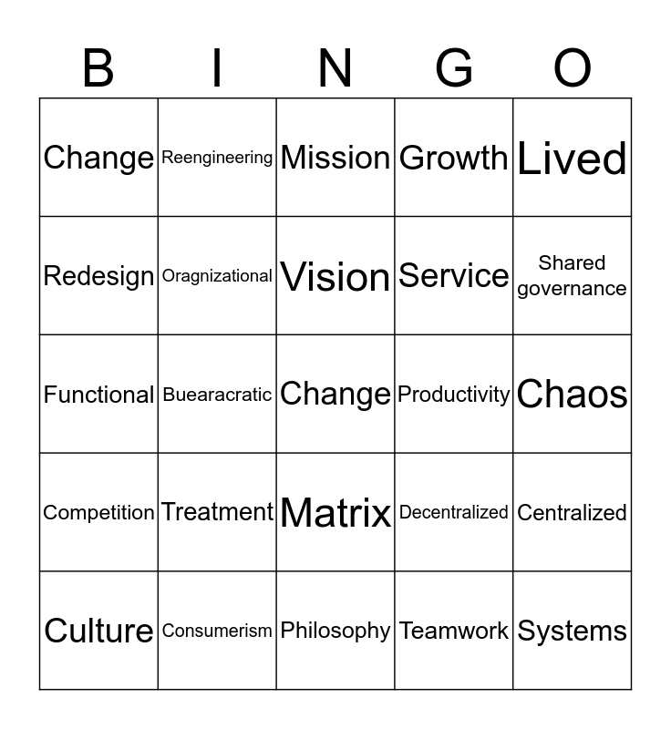 This bingo card has 25 words: Treatment, Philosophy, Vision, Culture, Lived, Change, Redesign, Reengineering, Productivity, Matrix, Service, Functional, Decentralized, Centralized, Oragnizational, Systems, Chaos, Mission, Shared governance, Buearacratic, Change, Consumerism, Competition, Growth and Teamwork.