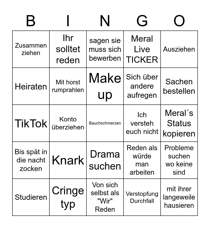 This bingo card has a free space and 24 words: Knark, Cringe typ, Make up, Studieren, Ausziehen, Zusammen ziehen, Heiraten, Ihr solltet reden, Ich versteh euch nicht, Drama suchen, Sich über andere aufregen, TikTok, Reden als würde man arbeiten, Probleme suchen wo keine sind, Mit horst rumprahlen, Verstopfung Durchfall, Meral´s Status kopieren, sagen sie muss sich bewerben, Sachen bestellen, Konto überziehen, mit ihrer langeweile hausieren, Bis spät in die nacht zocken, Meral Live TICKER and Von sich selbst als "Wir" Reden.