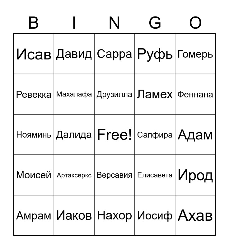 This bingo card has a free space and 27 words: Елисавета, Орфа, Ламех, Нахор, Ревекка, Сарра, Давид, Моисей, Сапфира, Ирод, Нояминь, Руфь, Амрам, Иаков, Феннана, Асенефа, Махалафа, Друзилла, Артаксеркс, Исав, Адам, Иосиф, Далида, Ахав, Версавия, Гомерь and Иаиль.