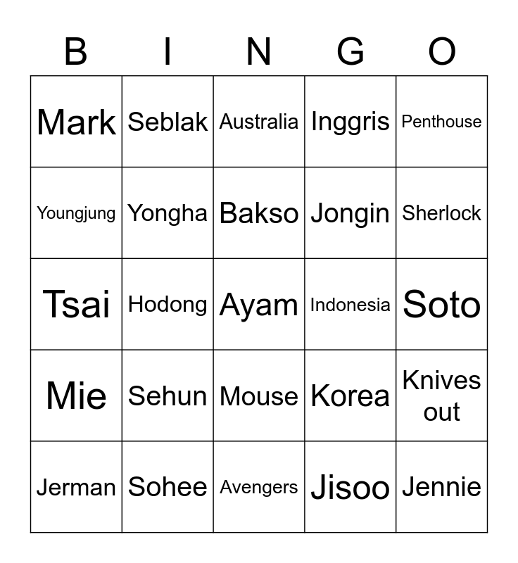This bingo card has a free space and 24 words: Sehun, Sohee, Bakso, Jerman, Penthouse, Mark, Youngjung, Seblak, Indonesia, Mouse, Jongin, Tsai, Korea, Knives out, Yongha, Jisoo, Soto, Australia, Sherlock, Hodong, Jennie, Mie, Inggris and Avengers.