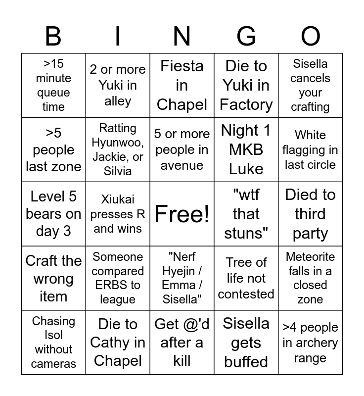 This bingo card has a free space and 24 words: Chasing Isol without cameras, Someone compared ERBS to league, 5 or more people in avenue, Sisella gets buffed, Sisella cancels your crafting, >15 minute queue time, 2 or more Yuki in alley, Fiesta in Chapel, "wtf that stuns", Died to third party, Level 5 bears on day 3, Ratting Hyunwoo, Jackie, or Silvia, Tree of life not contested, Meteorite falls in a closed zone, >5 people last zone, Die to Cathy in Chapel, Get @'d after a kill, Die to Yuki in Factory, White flagging in last circle, Craft the wrong item, Xiukai presses R and wins, "Nerf Hyejin / Emma / Sisella", Night 1 MKB Luke and >4 people in archery range.