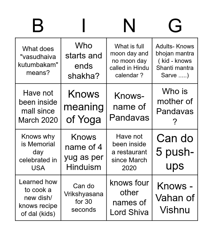 This bingo card has 16 words: Can do Vrikshyasana for 30 seconds, Can do 5 push-ups, What is full moon day and no moon day called in Hindu calendar ?, What does "vasudhaiva kutumbakam" means?, Knows why is Memorial day celebrated in USA, Who starts and ends shakha?, Have not been inside a restaurant since March 2020, knows four other names of Lord Shiva, Have not been inside mall since March 2020, Knows meaning of Yoga, Learned how to cook a new dish/ knows recipe of dal (kids), Adults- Knows bhojan mantra ( kid - knows Shanti mantra Sarve .....), Knows name of 4 yug as per Hinduism, Who is mother of Pandavas ?, Knows- name of Pandavas and Knows - Vahan of Vishnu.