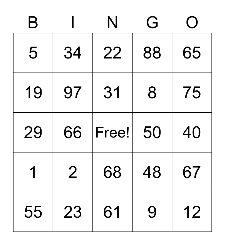 This bingo card has a free space and 24 words: 2, 23, 31, 55, 65, 5, 19, 34, 50, 68, 8, 29, 48, 67, 97, 9, 40, 22, 75, 66, 12, 1, 88 and 61.