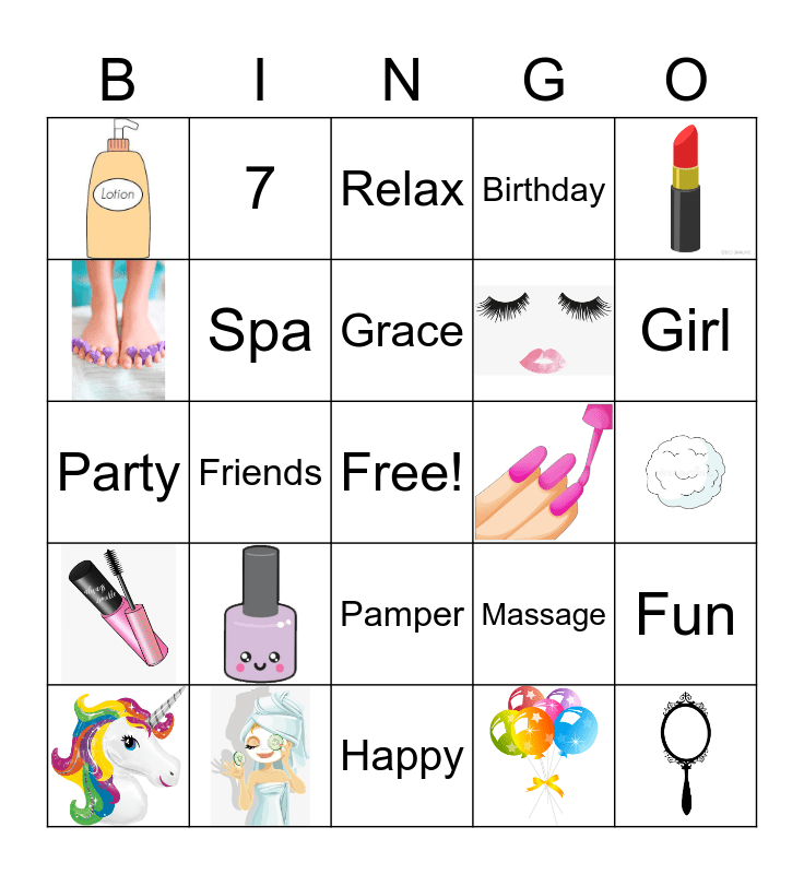 This bingo card has 12 images, a free space and 12 words: Grace, 7, Pamper, Party, Massage, Fun, Spa, Relax, Girl, Friends, Birthday and Happy.