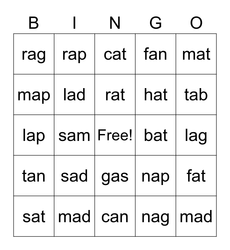 This bingo card has a free space and 24 words: sad, mad, rat, sat, mat, rag, map, rap, bat, gas, hat, lap, nap, fat, lad, nag, lag, cat, tab, sam, mad, tan, fan and can.