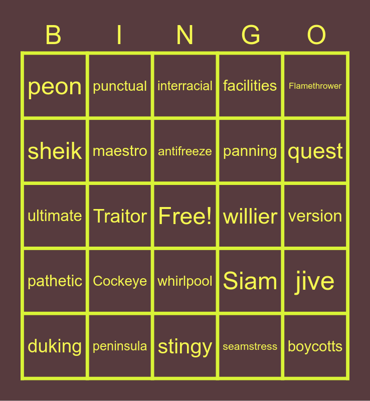 This bingo card has a free space and 39 words: Automatically, rabies, flypaper, maestro, duking, whirlpool, antifreeze, trespassing, Flamethrower, pathetic, Traitor, facilities, boycotts, version, willier, Cockeye, temptations, peon, redneck, Siam, sheik, stingy, panning, quest, confrontations, strove, sonic boom, provoke, pervasive, punctual, miraculous, duking, interracial, peninsula, seamstress, udders, jive, ultimate and frostbite.