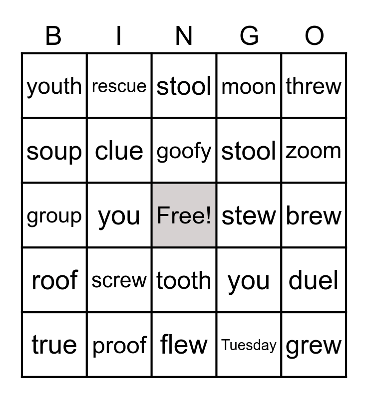 This bingo card has a free space and 24 words: screw, proof, goofy, true, threw, youth, soup, rescue, stew, tooth, stool, group, you, duel, clue, Tuesday, brew, stool, zoom, you, grew, roof, moon and flew.