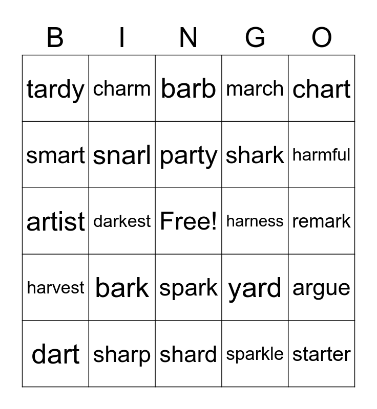 This bingo card has a free space and 24 words: bark, sharp, party, dart, chart, tardy, smart, charm, harness, spark, shark, artist, yard, argue, snarl, sparkle, remark, barb, harmful, darkest, starter, harvest, march and shard.
