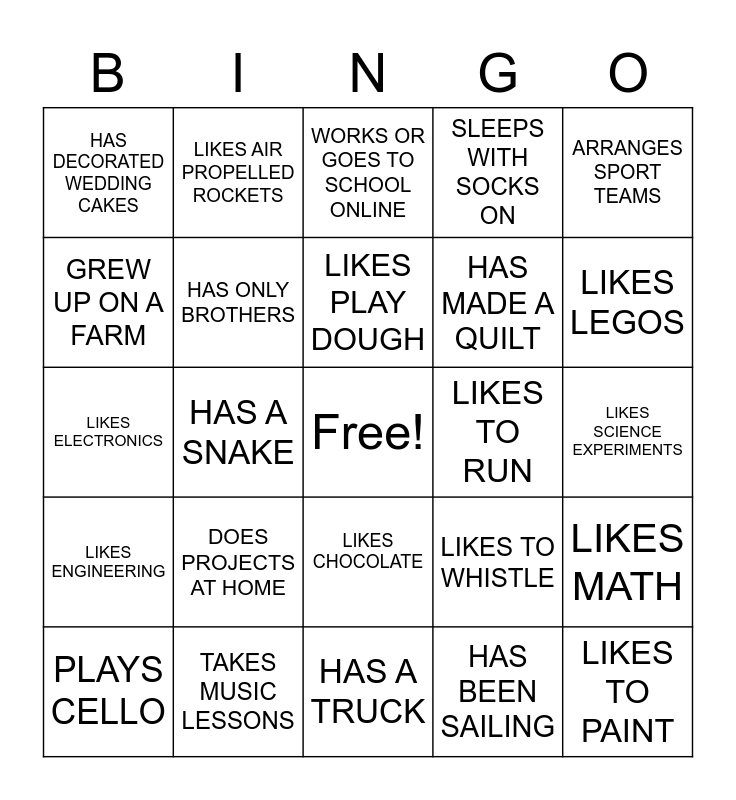 This bingo card has a free space and 26 words: LIKES CHOCOLATE, HAS BEEN SAILING, LIKES PLAY DOUGH, TAKES MUSIC LESSONS, ARRANGES SPORT TEAMS, HAS DECORATED WEDDING CAKES, GREW UP ON A FARM, LIKES AIR PROPELLED ROCKETS, LIKES SCIENCE EXPERIMENTS, LIKES TO WHISTLE, HAS MADE A QUILT, LIKES ELECTRONICS, LIKES MATH, PLAYS CELLO, HAS A SNAKE, LIKES TO HEAR CHILDREN READ, SLEEPS WITH SOCKS ON, LIKES ENGINEERING, WORKS OR GOES TO SCHOOL ONLINE, LIKES TO PAINT, LIKES LEGOS, HAS A TRUCK, LIKES TO RUN, DOES PROJECTS AT HOME, HAS ONLY BROTHERS and IS THE YOUNGEST IN THE FAMILY.