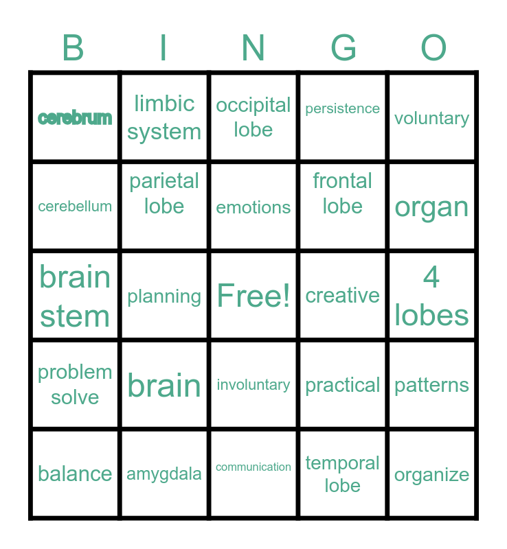 This bingo card has a free space and 24 words: brain, amygdala, emotions, balance, voluntary, cerebrum, cerebellum, limbic system, creative, involuntary, frontal lobe, brain stem, practical, patterns, parietal lobe, temporal lobe, 4 lobes, occipital lobe, organ, planning, organize, problem solve, persistence and communication.