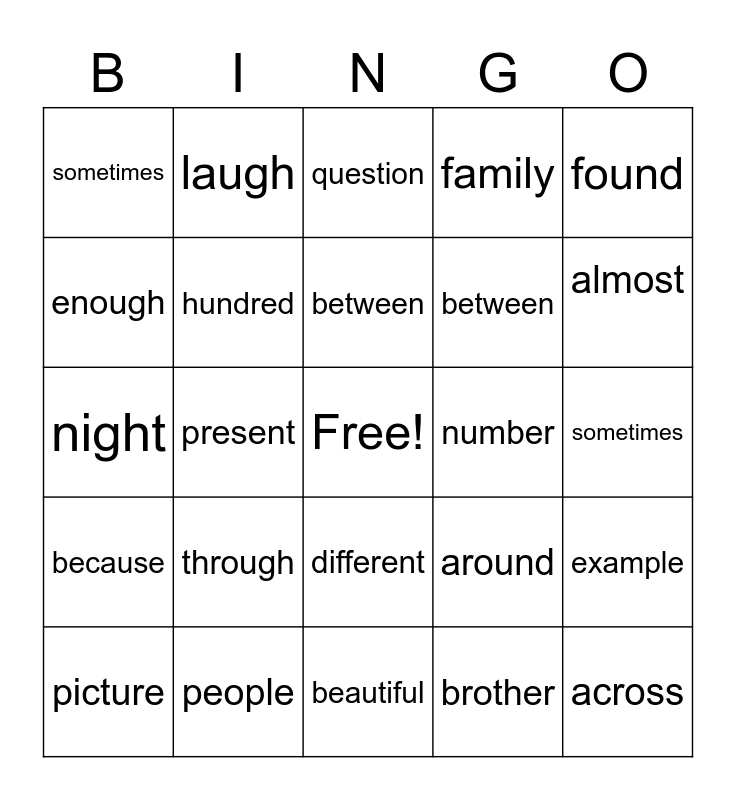 This bingo card has a free space and 24 words: through, people, between, picture, found, sometimes, enough, laugh, number, different, between, night, around, example, hundred, brother, sometimes, question, almost, present, across, because, family and beautiful.