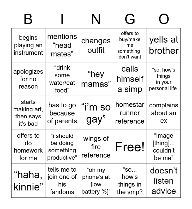 This bingo card has 25 words: “i should be doing something productive”, “oh my phone’s at [low battery %]”, “hey mamas”, “haha, kinnie”, yells at brother, begins playing an instrument, apologizes for no reason, mentions “head mates”, homestar runner reference, wings of fire reference, calls himself a simp, starts making art, then says it’s bad, Free!, “image [thing]... couldn’t be me”, “drink some water/eat food”, doesn’t listen advice, complains about an ex, changes outfit, “so, how’s things in your personal life”, has to go because of parents, “i’m so gay”, tells me to join one of his fandoms, offers to do homework for me, offers to buy/make me something i don’t want and “so... how’s things in the smp?.