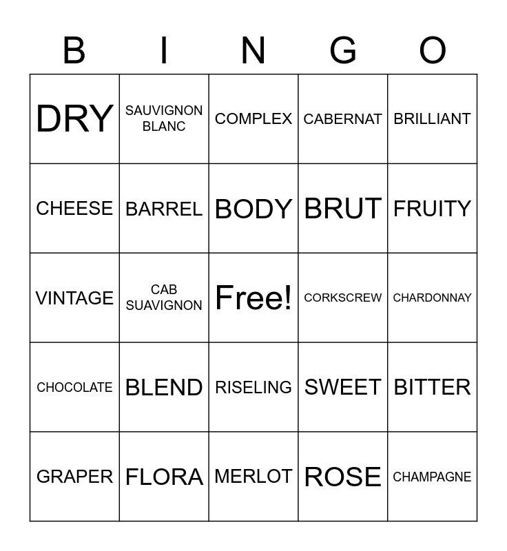 This bingo card has a free space and 38 words: AGING, AROMA, BALANCE, BARREL, BITTER, BLEND, BODY, BOTTLE, BRILLIANT, BRUT, CAB SUAVIGNON, CABERNAT, CHAMPAGNE, CHARDONNAY, CHEESE, CHOCOLATE, CITRIC, COMPLEX, CORK, CORKSCREW, DRY, FLORA, FRUITY, GRAPER, MATURE, MERLOT, OAK, OLIVES, PINOT, PORTO, RED WINE, RISELING, ROSE, SAUVIGNON BLANC, SHIRAZ, SWEET, VINTAGE and ZINFANDEL.