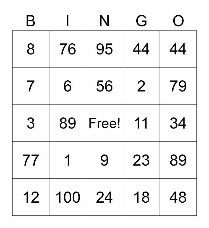 This bingo card has a free space and 24 words: 1, 100, 56, 12, 44, 8, 7, 76, 11, 9, 2, 3, 23, 89, 6, 18, 34, 95, 79, 89, 48, 77, 44 and 24.