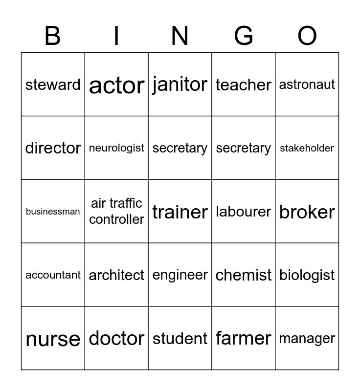This bingo card has a free space and 24 words: architect, doctor, secretary, nurse, astronaut, steward, director, actor, labourer, engineer, secretary, businessman, chemist, biologist, neurologist, farmer, broker, janitor, stakeholder, air traffic controller, manager, accountant, teacher and student.