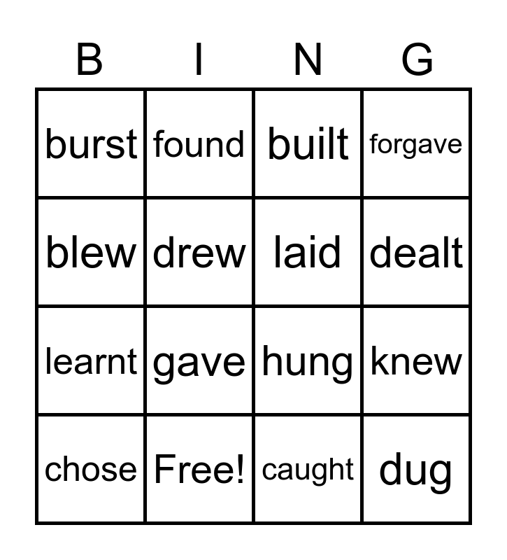This bingo card has 24 words: bore, burnt, dealt, drove, blew, burst, drew, found, Free!, fell, learnt, hung, fed, held, laid, fought, caught, built, gave, knew, chose, dug, forgave and kept.