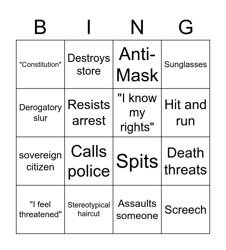 This bingo card has 16 words: Stereotypical haircut, Death threats, Anti-Mask, "Constitution", sovereign citizen, Destroys store, Spits, Assaults someone, Derogatory slur, Resists arrest, "I feel threatened", Sunglasses, Calls police, Hit and run, "I know my rights" and Screech.