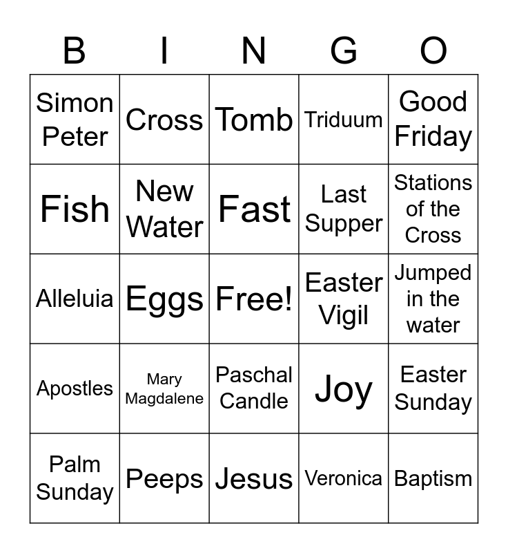 This bingo card has a free space and 25 words: Mary Magdalene, Jesus, Fast, Palm Sunday, Good Friday, Simon Peter, Fish, Cross, Easter Vigil, Paschal Candle, Last Supper, Alleluia, Joy, Easter Sunday, New Water, Resurrection, Jumped in the water, Tomb, Stations of the Cross, Eggs, Baptism, Peeps, Apostles, Triduum and Veronica.