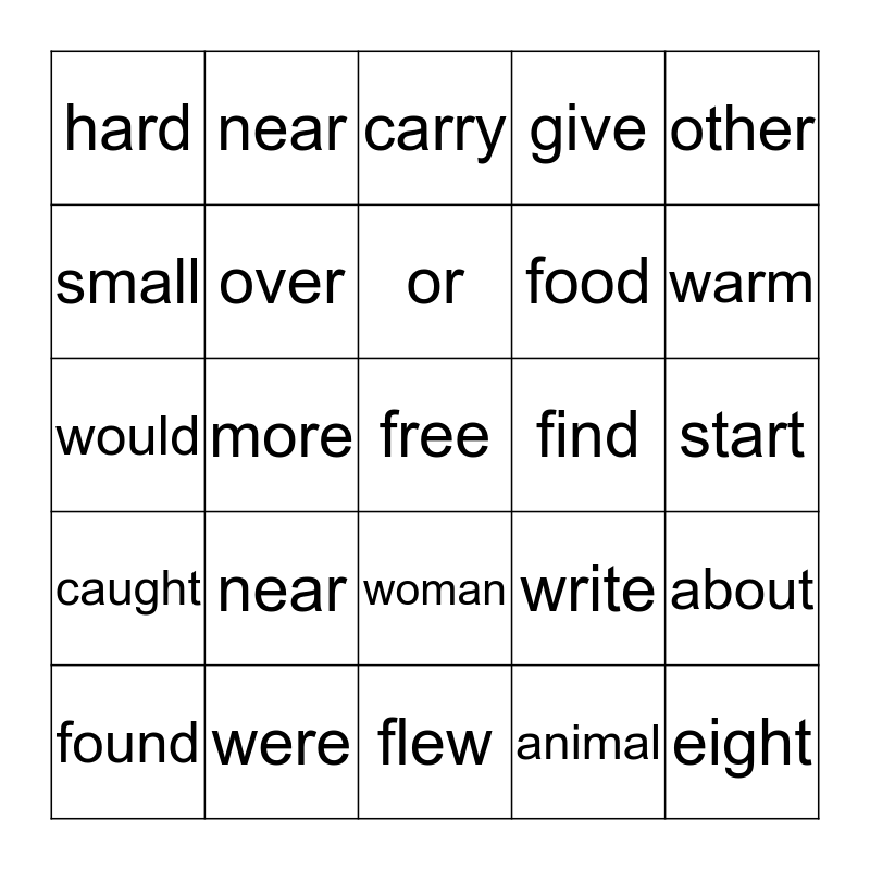 This bingo card has a free space and 24 words: near, were, or, found, other, hard, small, near, find, woman, food, would, write, about, over, animal, start, carry, warm, more, eight, caught, give and flew.