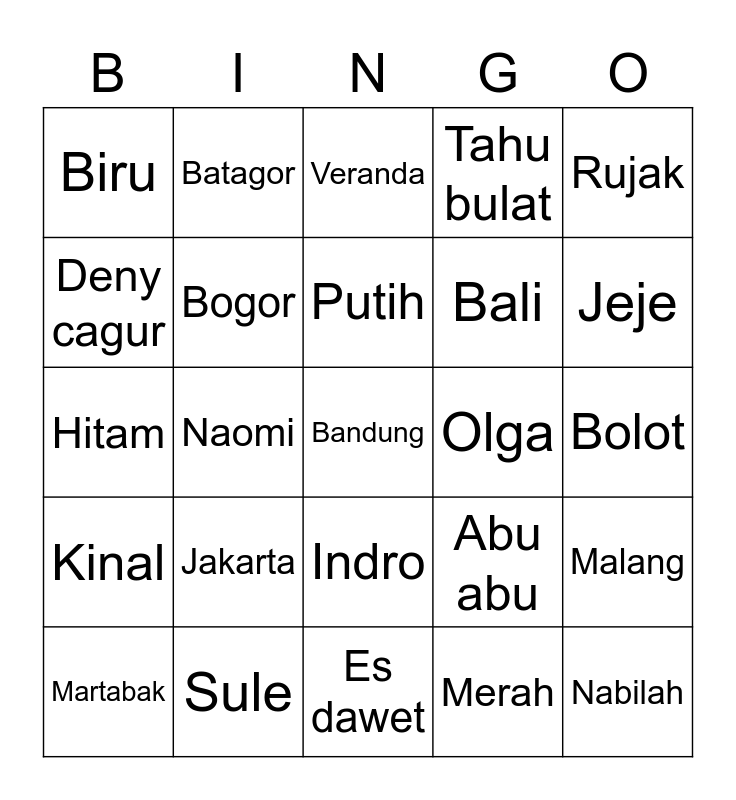 This bingo card has 25 words: Kinal, Sule, Bandung, Merah, Rujak, Biru, Batagor, Veranda, Olga, Malang, Deny cagur, Bogor, Es dawet, Abu abu, Jeje, Martabak, Naomi, Putih, Bali, Bolot, Hitam, Jakarta, Indro, Tahu bulat and Nabilah.