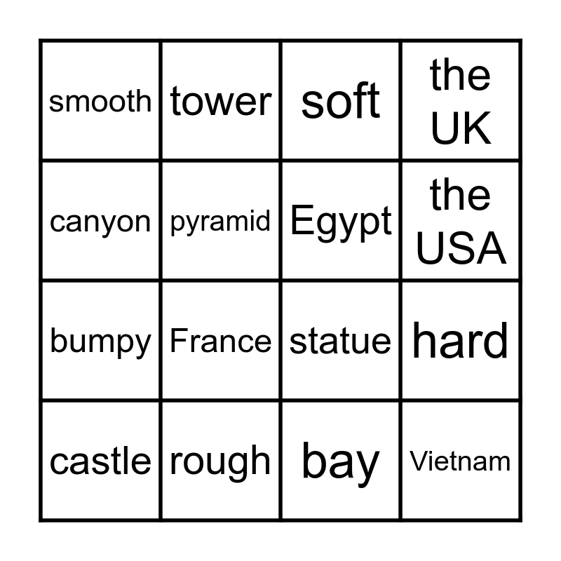 This bingo card has 16 words: rough, hard, soft, smooth, bumpy, tower, statue, bay, canyon, pyramid, castle, the UK, France, the USA, Egypt and Vietnam.