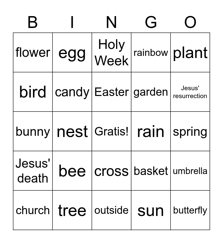 This bingo card has a free space and 24 words: bee, tree, Easter, church, plant, flower, bird, egg, rain, cross, garden, bunny, basket, umbrella, candy, sun, spring, Holy Week, Jesus' resurrection, nest, butterfly, Jesus' death, rainbow and outside.