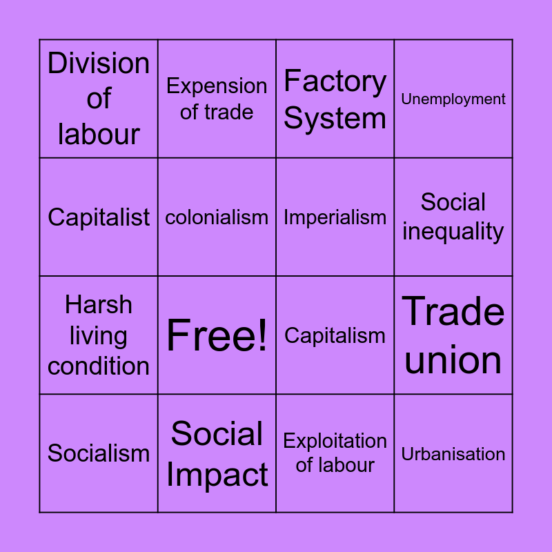 This bingo card has 18 words: Free!, Urbanisation, Factory System, Division of labour, Capitalism, Unemployment, Socialism, Expension of trade, Social inequality, Harsh living condition, Exploitation of labour, Capitalist, Trade union, colonialism, Imperialism, Political Impact, Social Impact and Economic Impact.