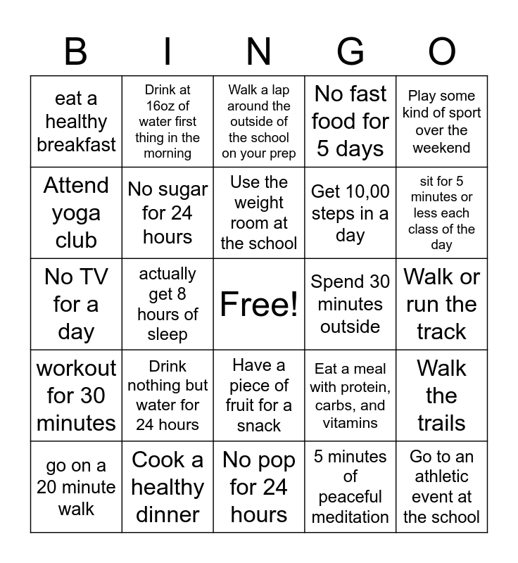 This bingo card has a free space and 24 words: Drink nothing but water for 24 hours, Cook a healthy dinner, Use the weight room at the school, go on a 20 minute walk, Play some kind of sport over the weekend, eat a healthy breakfast, Attend yoga club, Drink at 16oz of water first thing in the morning, Spend 30 minutes outside, Have a piece of fruit for a snack, Get 10,00 steps in a day, No TV for a day, Eat a meal with protein, carbs, and vitamins, Walk the trails, No sugar for 24 hours, 5 minutes of peaceful meditation, Walk or run the track, Walk a lap around the outside of the school on your prep, sit for 5 minutes or less each class of the day, actually get 8 hours of sleep, Go to an athletic event at the school, workout for 30 minutes, No fast food for 5 days and No pop for 24 hours.