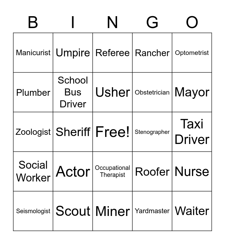 This bingo card has a free space and 24 words: Actor, Scout, Usher, Seismologist, Optometrist, Manicurist, Plumber, Umpire, Stenographer, Occupational Therapist, Obstetrician, Zoologist, Roofer, Nurse, School Bus Driver, Yardmaster, Taxi Driver, Referee, Mayor, Sheriff, Waiter, Social Worker, Rancher and Miner.