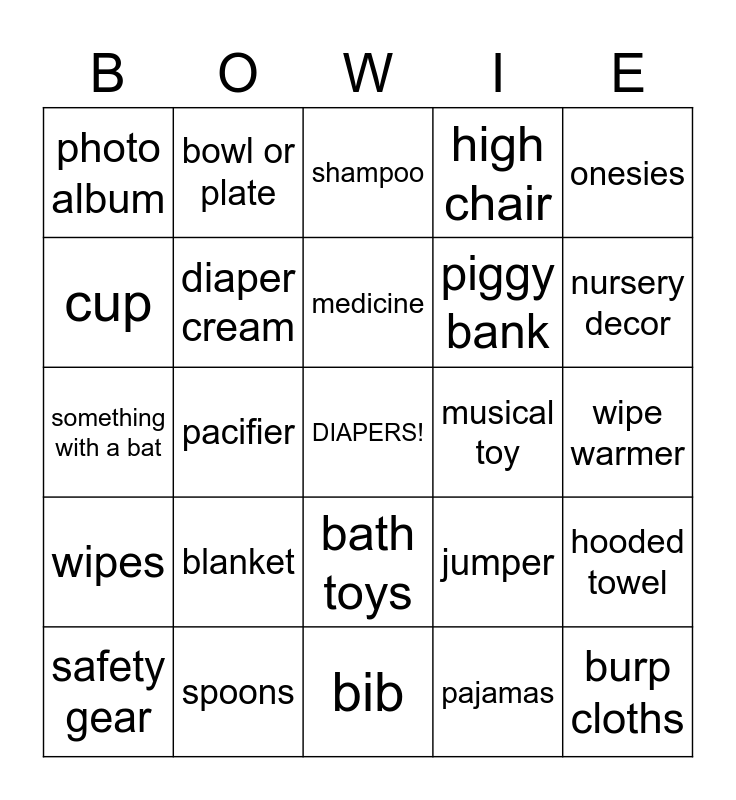 This bingo card has a free space and 51 words: bottle, burp cloths, bath tub, bib, blanket, bouncer, bowl or plate, car seat, cup, diaper bag, diaper cream, high chair, hooded towel, jumper, laundry detergent, lotion, medicine, musical toy, nursing pillow, onesies, pacifier, pajamas, photo album, piggy bank, play mat/gym, plush toy, nursery decor, sheet set, safety gear, shampoo, shoes, sling or carrier, socks or booties, handmade gift, personalized gift, spoons, stroller toy, teether, 1st aid kit, wash clothes, wipe warmer, wipes, rubber ducky, laundry basket, breast pump, star wars item, something with a bat, bottles, blocks, bath toys and gift card.