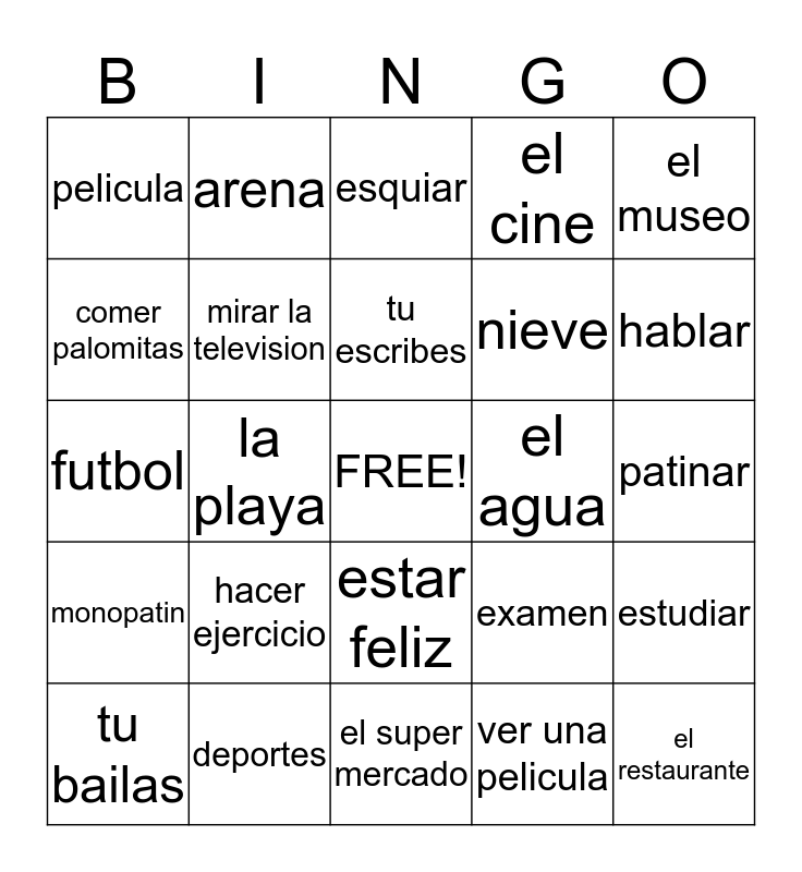 This bingo card has a free space and 24 words: hacer ejercicio, deportes, tu escribes, tu bailas, el museo, pelicula, comer palomitas, arena, el agua, estar feliz, nieve, futbol, examen, estudiar, mirar la television, ver una pelicula, patinar, esquiar, hablar, la playa, el restaurante, monopatin, el cine and el super mercado.