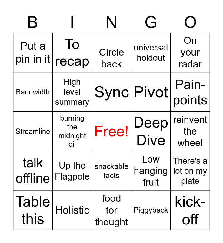This bingo card has a free space and 24 words: Up the Flagpole, Holistic, Sync, Table this, On your radar, Put a pin in it, Bandwidth, To recap, Deep Dive, snackable facts, Pivot, Streamline, Low hanging fruit, There's a lot on my plate, High level summary, Piggyback, reinvent the wheel, Circle back, Pain-points, burning the midnight oil, kick-off, talk offline, universal holdout and food for thought.