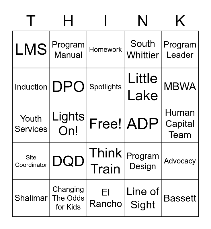 This bingo card has a free space and 34 words: TA Framework, Line of Sight, Randy Barth, QAC, Site Coordinator, DPO, Program Leader, Shalimar, Program Manual, Coaching, Spotlights, Homework, LA84, Soccer for Success, ADP, MBWA, Changing The Odds for Kids, Youth Services, DQD, Program Design, Think Train, Think Mart, LMS, Human Capital Team, El Rancho, Bassett, South Whittier, Puente LC, Little Lake, Induction, New Hire Orientation, Lights On!, Advocacy and Engagement.