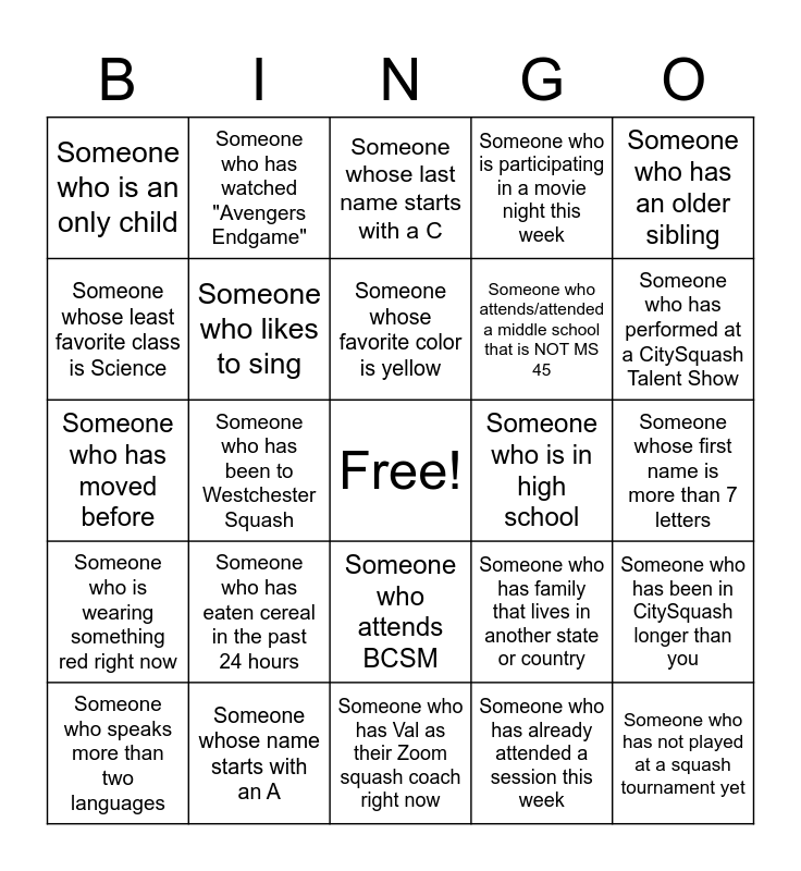 This bingo card has a free space and 24 words: Someone who has eaten cereal in the past 24 hours, Someone whose name starts with an A, Someone whose favorite color is yellow, Someone who speaks more than two languages, Someone who has an older sibling, Someone who is an only child, Someone whose least favorite class is Science, Someone who has watched "Avengers Endgame", Someone who is in high school, Someone who attends BCSM, Someone who attends/attended a middle school that is NOT MS 45, Someone who has moved before, Someone who has family that lives in another state or country, Someone who has been in CitySquash longer than you, Someone who likes to sing, Someone who has already attended a session this week, Someone whose first name is more than 7 letters, Someone whose last name starts with a C, Someone who has performed at a CitySquash Talent Show, Someone who has been to Westchester Squash, Someone who has not played at a squash tournament yet, Someone who is wearing something red right now, Someone who is participating in a movie night this week and Someone who has Val as their Zoom squash coach right now.