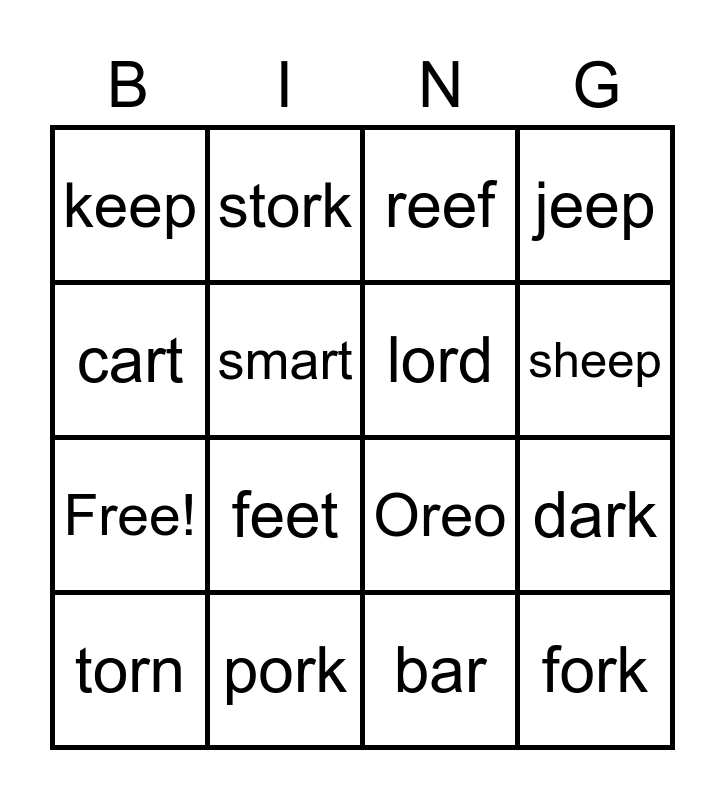 This bingo card has 25 words: tree, car, Oreo, orange, keep, stork, reef, jeep, Free!, feet, bar, dark, corn, pork, lord, meet, torn, smart, park, fork, cart, short, horn, sheep and born.