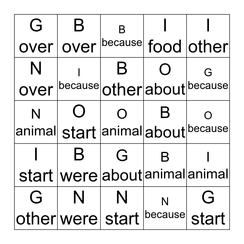 This bingo card has a free space and 24 words: B were, N were, B other, G other, I other, G over, N over, B over, B about, G about, O about, N animal, B animal, I animal, I because, N because, O because, B because, G because, O start, G start, I start, I food and N start.