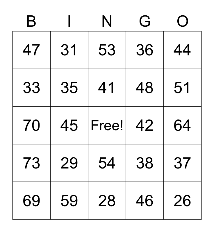 This bingo card has a free space and 50 words: 25, 26, 27, 28, 29, 30, 31, 32, 33, 34, 35, 36, 37, 38, 39, 30, 41, 42, 43, 44, 45, 46, 47, 48, 49, 50, 51, 52, 53, 54, 55, 56, 57, 58, 59, 60, 61, 62, 63, 64, 65, 66, 67, 68, 69, 70, 71, 72, 73 and 74.