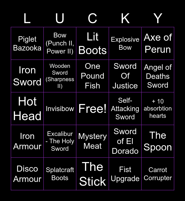 This bingo card has a free space and 46 words: Shotgun, Carrot Corrupter, Stick Of Truth, The Stick, Excalibur - The Holy Sword, Regular Bow, Bow (Punch II, Power II), 4 Stacks of Knockback 1 Snowballs, Iron Sword, Knockback X Slimeball, Wooden Sword (Sharpness II), Explosive Bow, The Spoon, Sword of El Dorado, Vomit Bagel, Happy Little Tree, One Pound Fish, Self-Attacking Sword, Magic Toy Stick, Axe of Perun, Invisibow, Fist Upgrade, Piglet Bazooka, Sword Of Justice, Anduril, Angel of Deaths Sword, Disco Armour, 'El Dorado' Armour, Mystery Meat, Iron Armour, Super Star, Greaster Jacket, 1 Up Mushroom, Speedster Boots, Upgrade Book, Splatcraft Boots, + 10 absorbtion hearts, Chilly Pants, Rage Armour, Manitou Boots, Cute Pants, Lit Boots, Hot Head, Frog Helmet, Stinged Leggings and OP Potion.