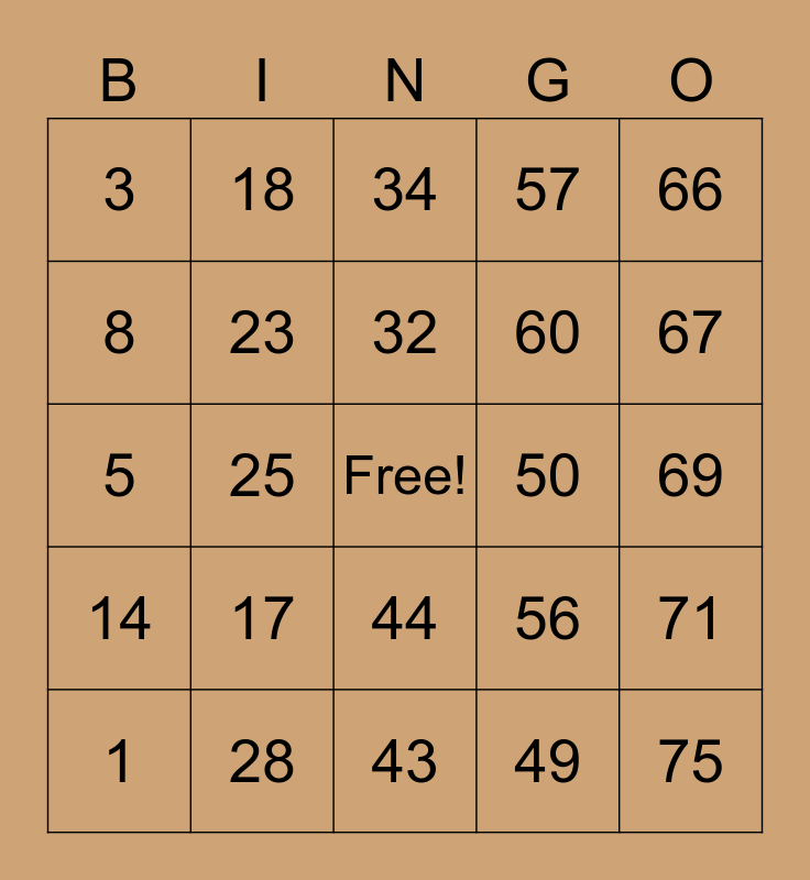 This bingo card has a free space and 24 words: 1, 17, 32, 49, 66, 3, 18, 34, 50, 69, 5, 23, 56, 71, 8, 28, 43, 57, 67, 14, 25, 44, 60 and 75.
